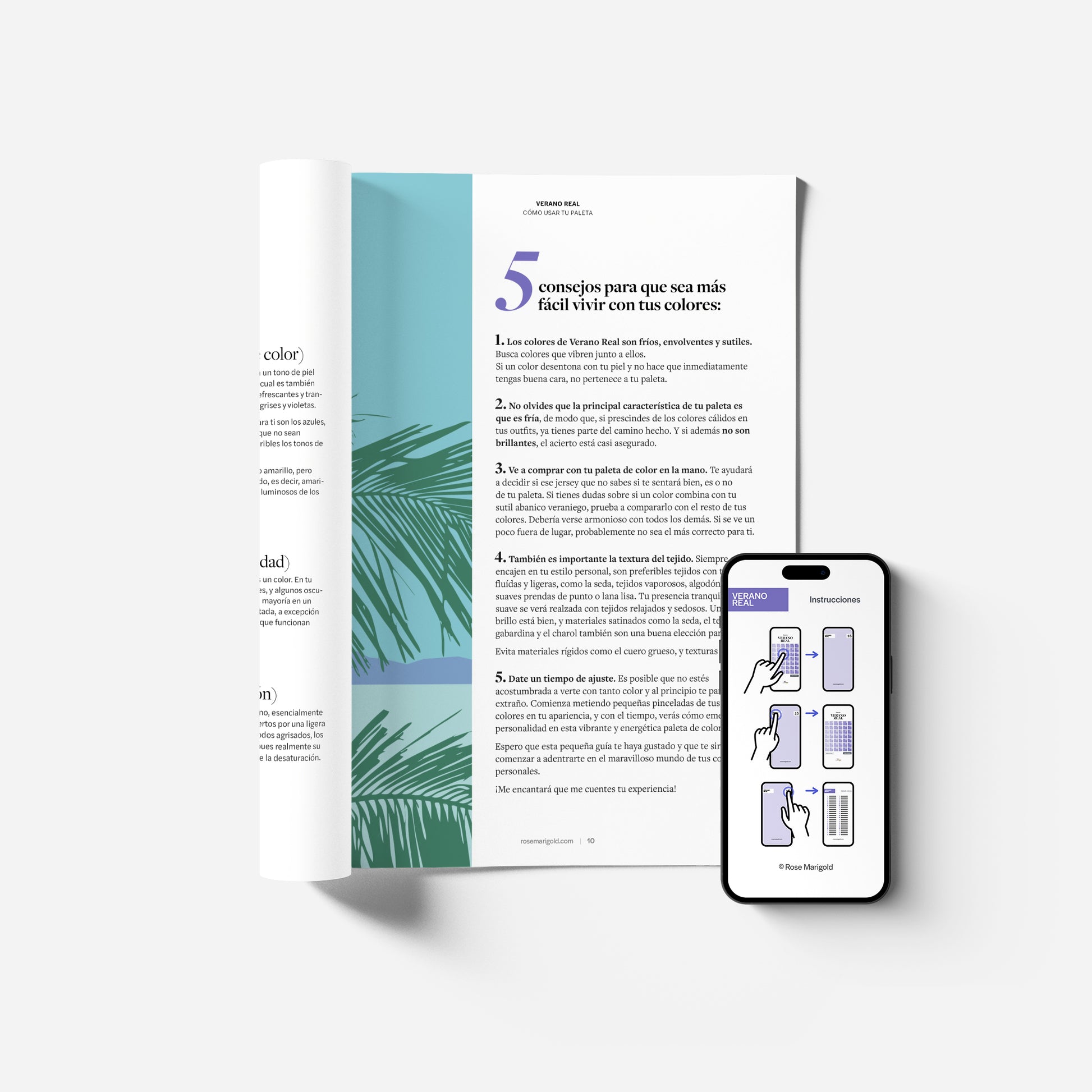 Tu Guía Personal en la que te explicamos por qué tus colores son los tuyos y no otros, lo que te servirá para aprender a identificarlos, más allá de estos primeros 42; qué colores evitar porque no te favorecen; qué tejidos te sientan mejor…